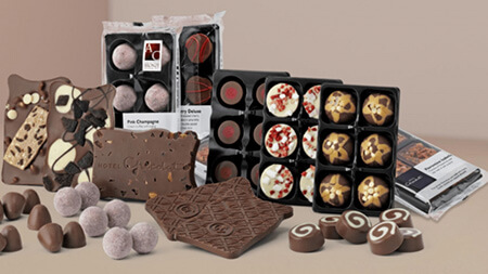 - این برند، انواع شکلاتهای شیری، تلخ و سفید را با طعمهای متنوع ارائه میدهد.